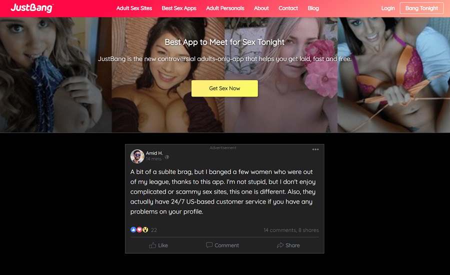Justbang.com is another site that claims to eliminate the problem of wanting to fuck and not having with whom. On Justbang, you’re not liable to find relationships-but sex.